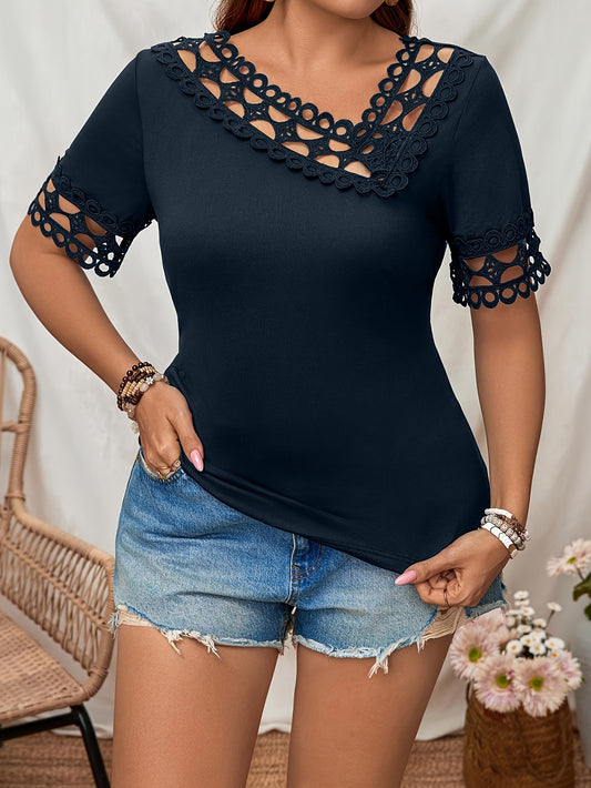 Կանացի Plus Size էլեգանտ կարճաթև վերնաշապիկ՝ ասիմետրիկ դեկոլտեով և ժանյակով կտրված դետալներով - Ձգվող պոլիեսթեր խառնուրդ, մեքենայով լվացվող, սև, կատարյալ գարուն/ամառ պատահական հանդերձանքների համար, գարնանային նորաձևության հագուստ | Ասիմետրիկ Ն