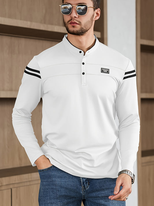 Տղամարդու ամենօրյա երկար թևքով մարզաշապիկ - միագույն, կանգնած օձիքով շերտավոր պոլո, կոճակներով առջևի մասով, իդեալական է բացօթյա գործունեության համար