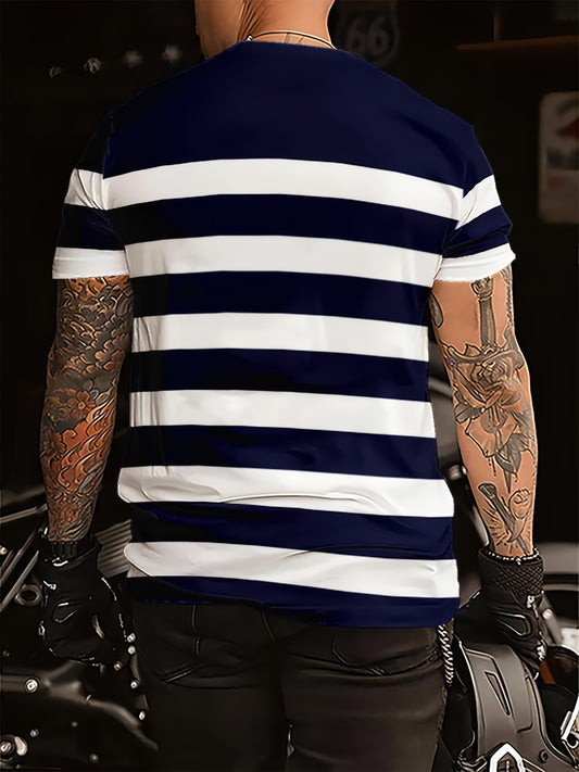 Տղամարդու կարճ թևքով, գծավոր, մուգ կապույտ, սպիտակ, ուղղահայաց շերտերով շապիկ՝ կլոր վզով, սովորական չափսերով, թեթև պոլիեսթերային գործվածքով, իդեալական է առօրյա հագուստի համար, դասական, գծավոր, թեթև շապիկ։