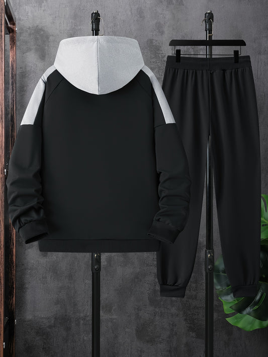 2pcs Men'S Casual Sportswear Set - Color Block Hooded Jacket and Pants, Polyester, Machine Washable, All-Season, with Pockets, Regular Fit, Spring Sportswear|Hooded Sportswear|Machine Washable Fabric