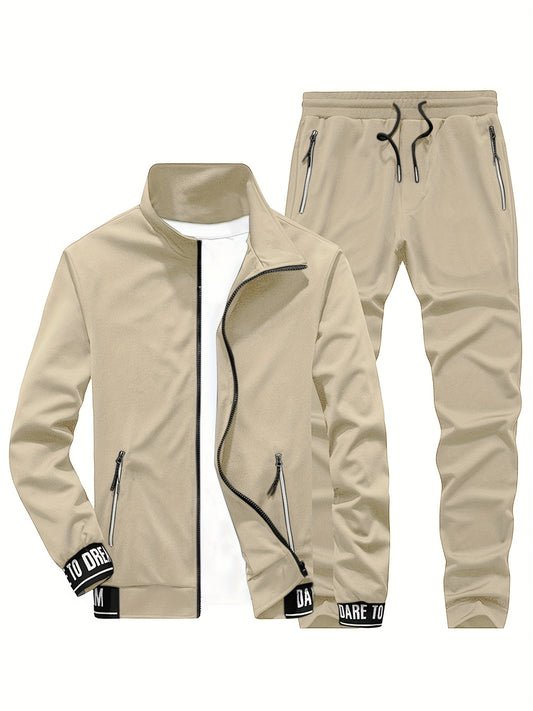 Տղամարդկանց ամենօրյա սպորտային հագուստի հավաքածու - բեժ գույնի ճարմանդով բաճկոն և մարզական տաբատ "DARE TO BE" տպագրությամբ, երկար թևերով, գրպաններով և քաշվող գոտիով, իդեալական է վազքի և հանգստի համար, գարուն/աշուն հավաքածու, գարուն-աշուն հագուստ | Zipup J