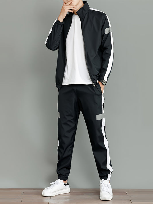 Men'S Spring/Fall Casual Sportswear Two-Piece Set - Black & White Contrast Color Block Jacket & Pants, Regular Fit Long Sleeve with Zippered Pockets for Hiking, Outdoor & Casual Wear, Hiking Clothes, Sporty Casual Attire, Con