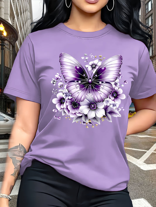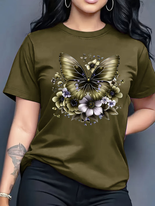 Women'S Floral Butterfly Print T-Shirt, Short Sleeve Crew Neck Casual Top for Spring & Summer, Vibrant Green with White & Blue Flowers, Perfect Birthday or Holiday Gift, Everyday Fashion | Vibrant Casual Top | Glossy Texture