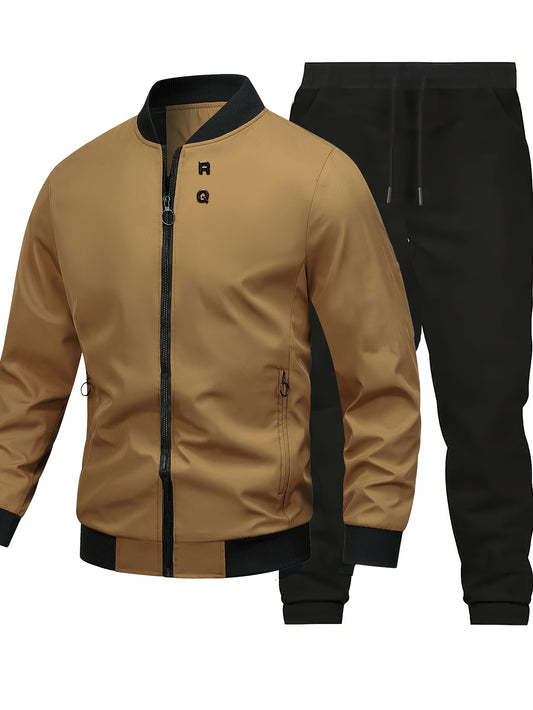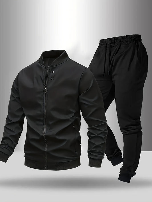 Տղամարդու ամենօրյա երկկտոր սպորտային հավաքածու՝ սև բեյսբոլի օձիքով բաճկոն՝ կայծակաճարմանդով, առաձգական գոտկատեղով տաբատ, սովորական չափսի՝ գարնանային/աշնանային սեզոնի համար, գարնանային վերնազգեստ | Սպորտային ամենօրյա հագուստ | կայծակաճարմանդով բաճկոն