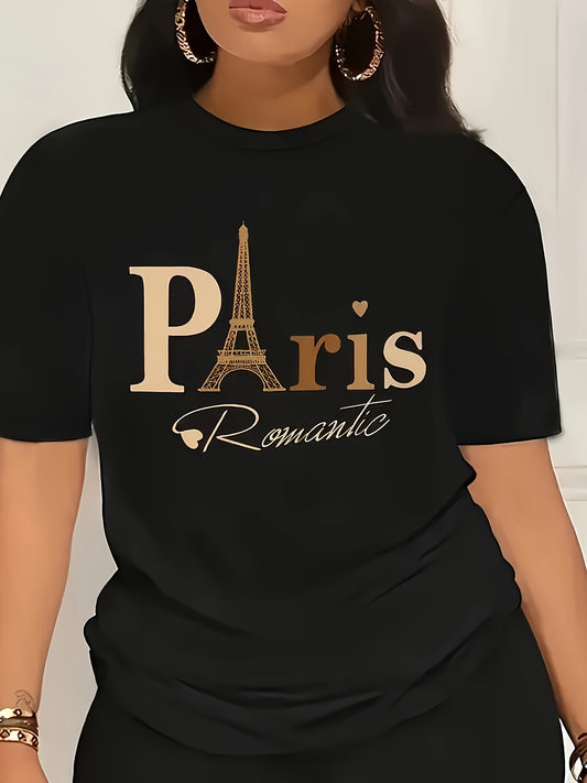 Women's Paris Romantic Graphic Print T-Shirt - Black & Golden Eiffel Tower Design, Short Sleeve Crew Neck Casual Top, Breathable Summer & Spring Tee, Machine Washable, Everyday Fashion, Fashionable Casualwear, Relaxed Fit Shi