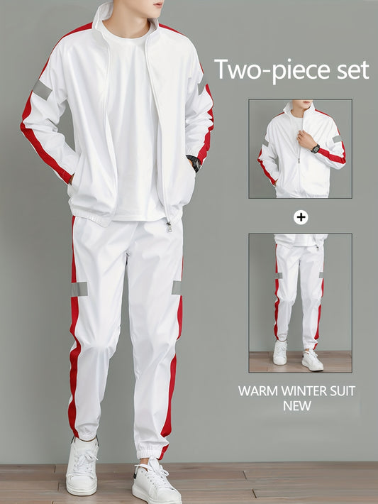 2025 թվականի տղամարդու սպորտային հավաքածու - սպիտակ և սև, երկար թևքերով, օձիքով, չձգվող գործվածքով, գրպաններով, գարնան/աշնան համար, ամենօրյա սպորտային հագուստ, ամենօրյա սպորտային հագուստ | ժամանակակից սպորտային | գրպաններով բաճկոն