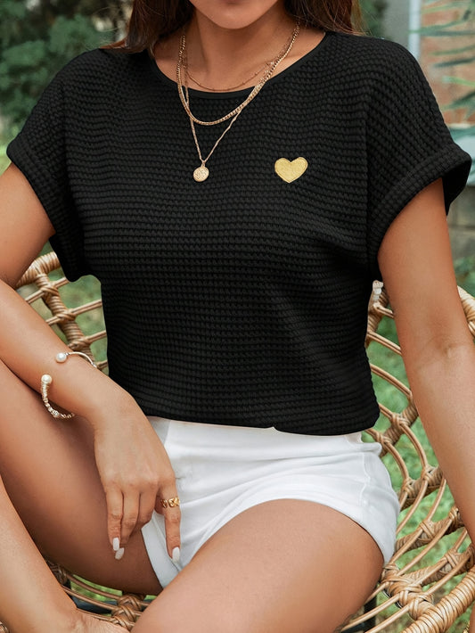 Կանացի սև տրիկոտաժե կարճ թևքերով վերնաշապիկ՝ ոսկեգույն սրտի նախշերով - ամենօրյա, կլոր վզնոցով, գարուն/ամառ նորաձևություն, ամենօրյա հագուստ | Կլոր վզնոցով վերնաշապիկ | Տրիկոտաժե հյուսվածք
