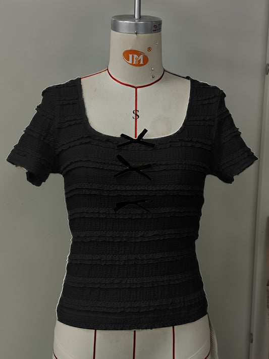 Կանացի էլեգանտ կարճ թևքով շապիկ՝ ծալքավոր եզրագծով առջևի ժապավենի դետալով - Թեթև, առօրյա լողափնյա արձակուրդային վերնաշապիկ, միագույն, գարուն/ամառ հավաքածու, լողափնյա արձակուրդային վերնաշապիկ | Ծալքավոր եզրագծով վերնաշապիկ | Թեթև գործվածք