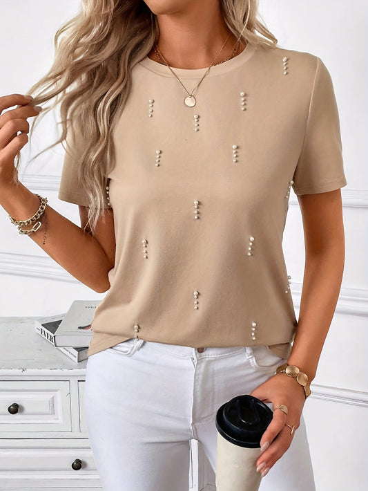 Կանացի կարճ թևքերով, ուլունքներով զարդարված մարզաշապիկ՝ կլոր վզով, գարնանային և ամառվա համար, թեթև պոլիեսթերի խառնուրդ, էլեգանտ ուլունքներով զարդարանք, իդեալական է ամենօրյա հագուստի համար։