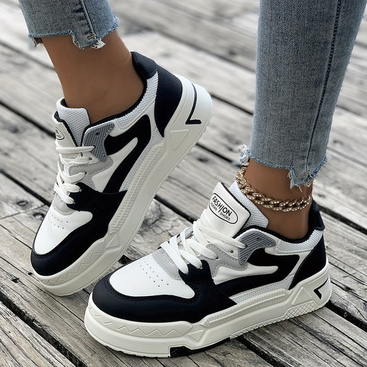 Մեկ զույգ կանացի նորաձև, առօրյա սպորտային կոշիկներ, հարմարավետ, շնչող ցանցկեն, դասական սև և սպիտակ գույնի, կլոր քթով, կապիչով ոճով, հարթ «Classic Sneaker» շարք, հարմար է ամենօրյա հանգստի և գարնանային զբոսանքների համար։