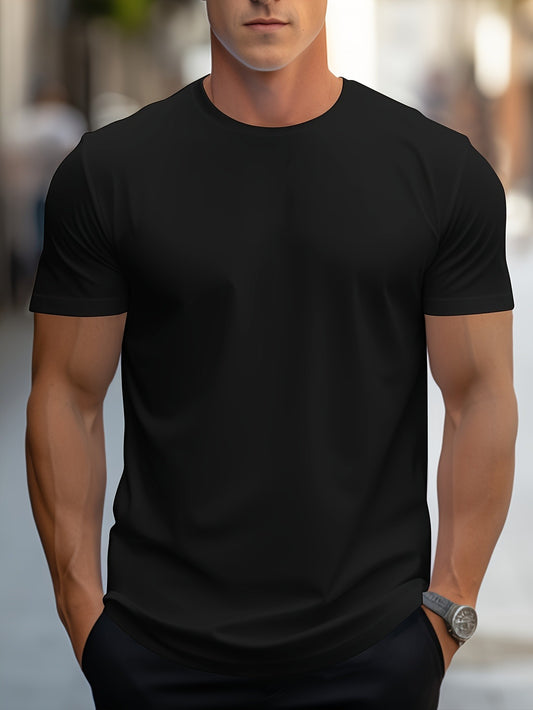 Տղամարդու կարճ թևքերով, ձգվող, շնչող, հարմարավետ պոլիեսթերի խառնուրդով, միագույն կապույտ, կլոր վզնոցով, գարուն/ամառային առօրյա, սպորտային ոճով։