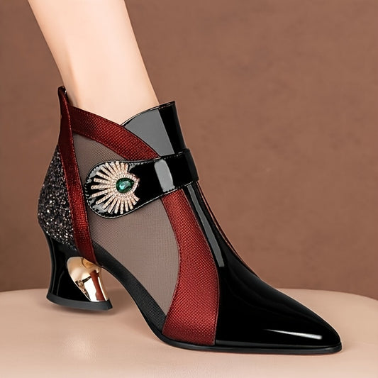 Women's Burgundy Synthetic Cover Mary Jane High Heels - Pointed Toe Chunky Block Heel with Adjustable Ankle Strap Golden Buckle, Glossy Finish for Spring, Casual Formal Events, Casual Chic Shoes Pointed Toe Heels Dura