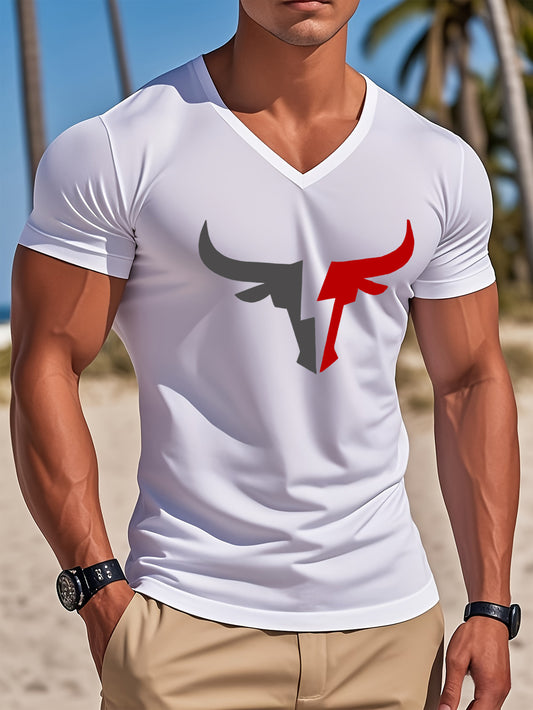 Տղամարդու ամենօրյա V-ձև օձիքով շապիկ՝ գլխի համարձակ գրաֆիկական նախշերով - սպիտակ-սև կոնտրաստային դիզայնով, շնչող, կանոնավոր չափսի կարճ թևքով շապիկ՝ գարուն-ամառ ամենօրյա հագուստի համար, որակյալ գործվածքից վերնաշապիկ։
