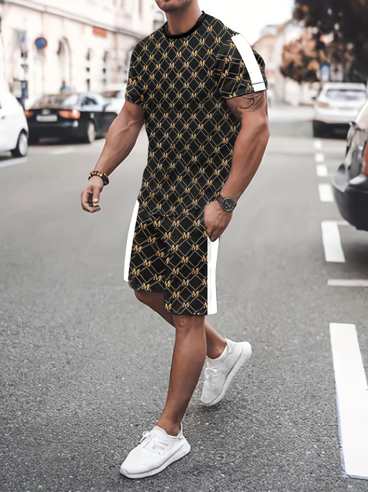 2pcs set for men in spring, summer and autumn with M letter print pattern and white side color suit - breathable round neck short-sleeved T-shirt and comfortable elastic waist shorts with pockets - complete Men's casual wear