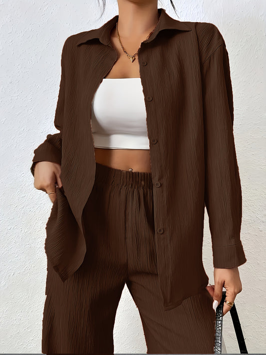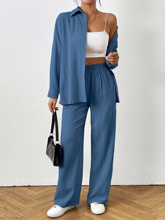 Էլեգանտ կանացի երկկտոր հանդերձանք. միագույն կոճակներով վերնաշապիկ և լայն տաբատ - պոլիեսթեր, լվացքի մեքենայով - իդեալական է գարնան/աշնան համար