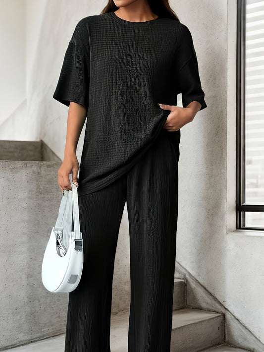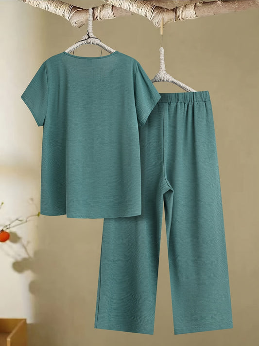 Elegant Women'S Polo Shirt and Wide-Leg Pants Set - Chic Solid Color, V-Neck Short Sleeve with Belt, Casual Spring/Summer Outfit, Polyester Blend, Button Details, Wide Leg Pants, Casual Attire|Vneck Top|Polyester Fabri