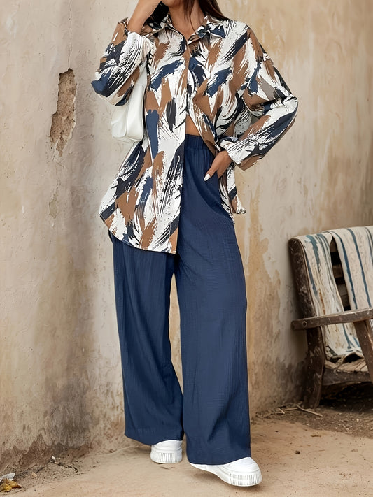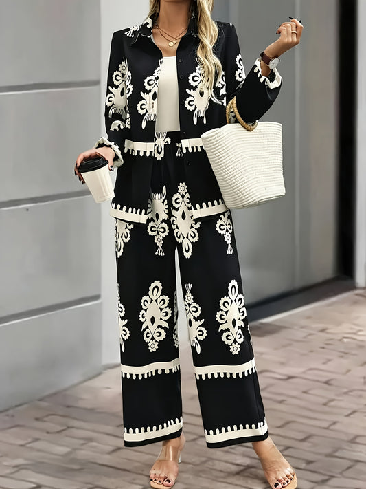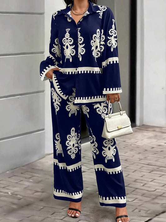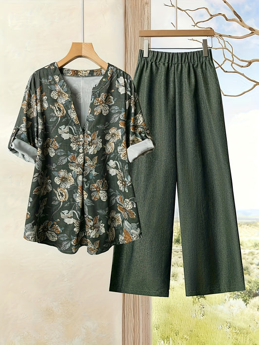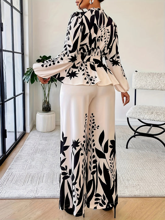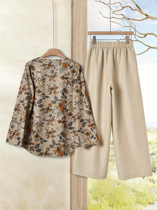 Էլեգանտ էթնիկ ոճի ազատ վերնաշապիկ և միագույն ամենօրյա տաբատ 2 հատանոց հավաքածու կանանց համար - շքեղ V-ձև դեկոլտեով, ծաղկային նախշերով, երկար թևքերով, պոլիեսթերի խառնուրդ, իդեալական է գարուն/ամառ/աշուն համար։