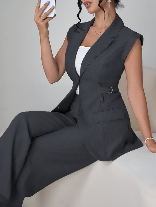 Գարուն/ամառվա նորաձև կանացի, էլեգանտ, ժամանակակից, երկկտոր հավաքածու՝ կողային գոտկատեղի դիզայնով, միագույն անթև բաճկոն և տաբատ