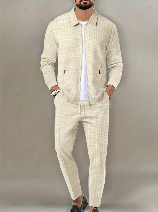 Men's solid color fashionable sportswear, waffle full zipper casual long sleeved jacket and jogging pants set, Men's fitness exercise outdoor running clothing
