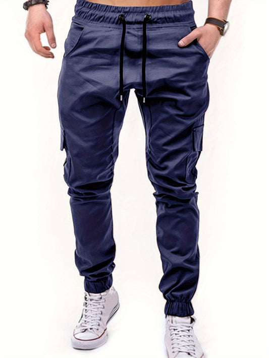 Men's Solid Color Multi-pocket Cargo Pants With Drawstrings, Casual Stylish Sports Trousers As Gift