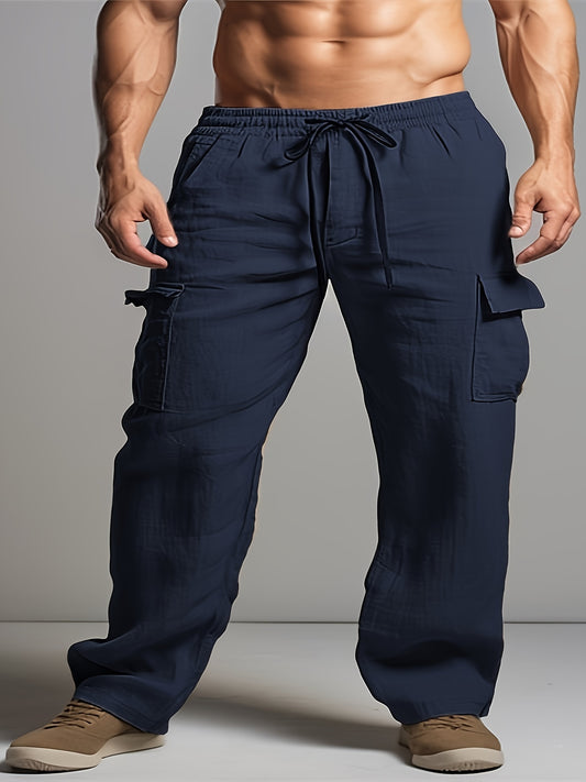 Solid Retro Men's Cotton And Linen Drawstring Long Trousers With Multiple Pockets, Outdoor Daily