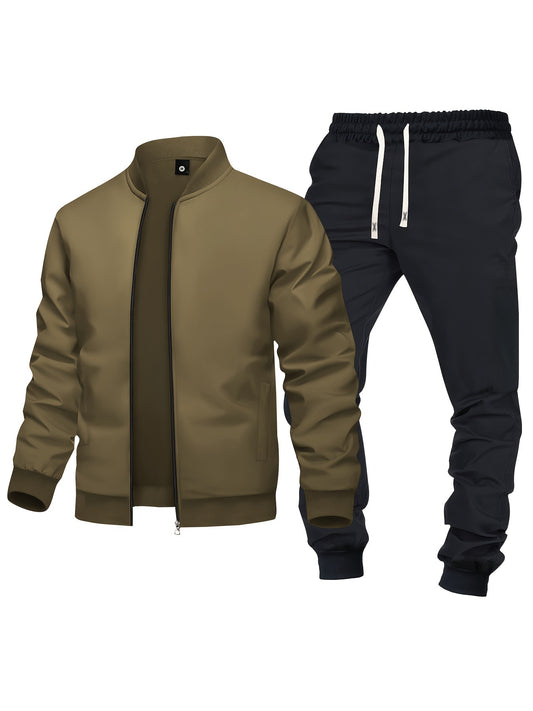 Men's Spring/Fall Casual Zip-Up Jacket & Drawstring Sweatpants Set in Olive Green & Black - Durable Polyester, Machine Washable, with Pockets for Everyday Style