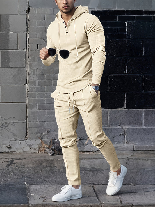 Men'S Two-Piece Solid Color Waffle Set for Spring And Autumn, Featuring a Long-Sleeve Hoodie And Drawstring Pants with Pockets, Perfect for Outdoor Sports And Casual Wear.