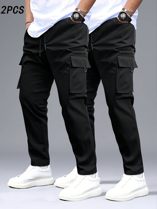 2pcs Men's Cargo Pants, Black & Gray with Drawstring Waist and Multiple Pockets, Durable Polyester, Ideal for Outdoor Activities and Casual Wear, Casual Wear Pants | Multiple Pocket Design | Durable Fabric Pants