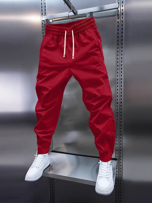 Men's Lightweight Red Joggers with Zipper Pockets - Casual Sports Pants, Elastic Waistband, Polyester Blend, Ideal for Running & Outdoor Activities, Jogging Pants