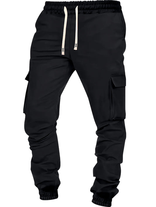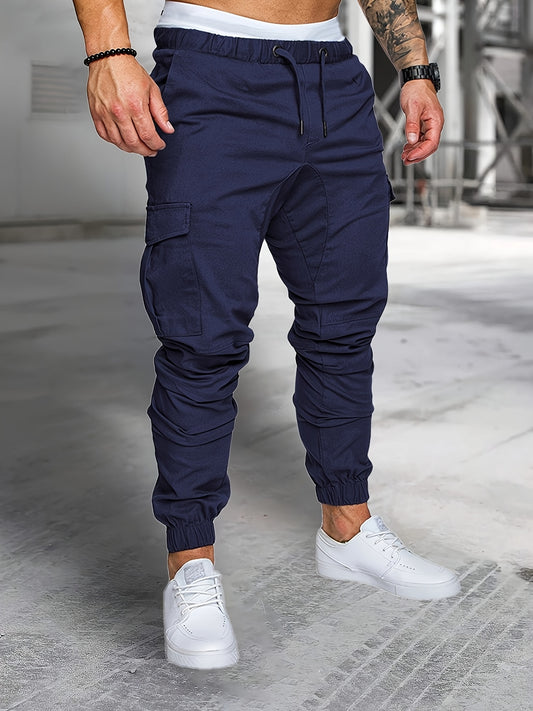 Men's Casual Athletic Cargo Pants - Solid Color, Polyester, Machine Washable with Multiple Pockets