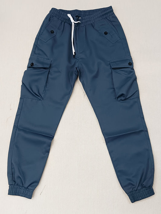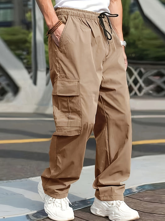 Men's Solid Cargo Pants With Multi Pockets, Causal Drawstring Trousers For Outdoor Activities