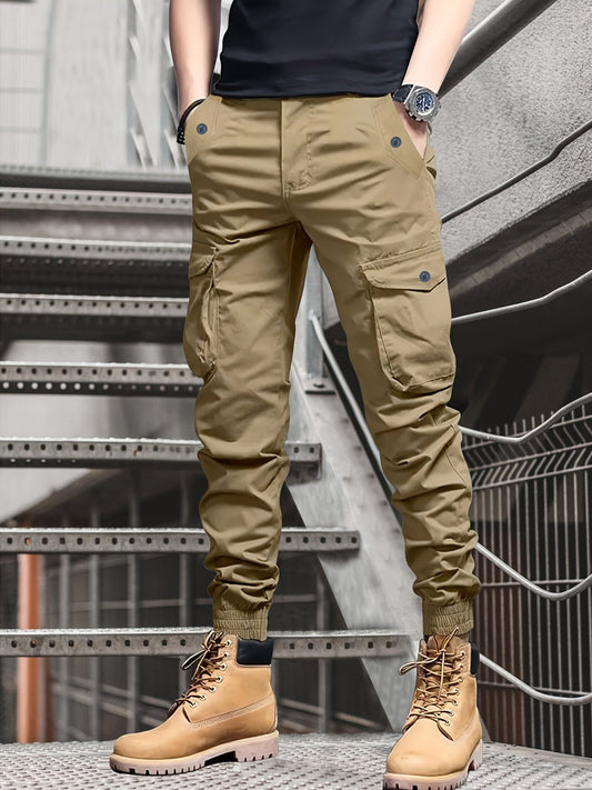 1pc Men'S Casual Polyester Cargo Pants - Mid Waist Elastic Joggers with Multiple Pockets, Non-Stretch Solid Color, Regular Fit for Weekend Wear - Spring/Fall Fashion Trousers