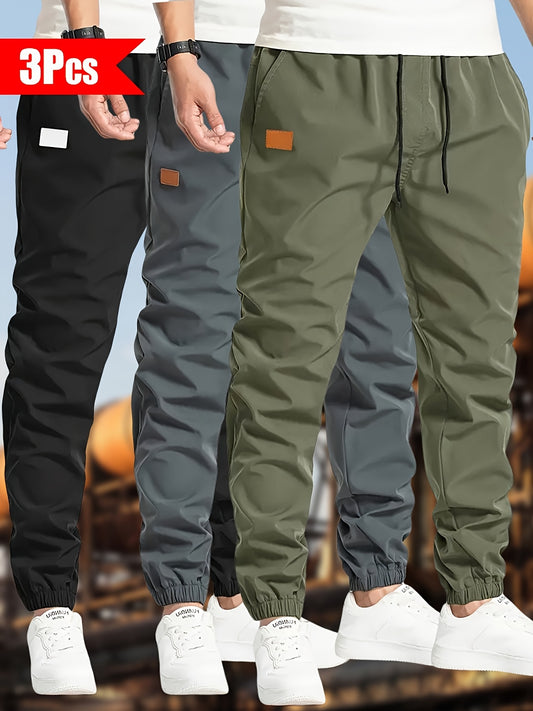 3pcs Men's Solid Color Drawstring Joggers - Casual Cargo Cropped Pants, Polyester, Machine Washable, in Black, Dark Gray, Olive Green with Patch Detail