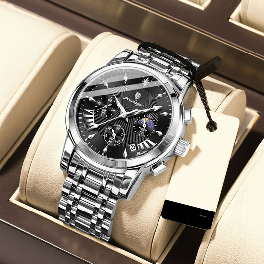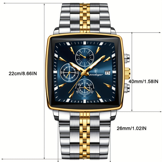 POEDAGAR Men's Stainless Steel Luminous Watch - Blue Dial Chronograph, High Quality Quartz Movement with Date Calendar, Golden-Tone Accents for Business Casual & Casual Attire, Formal Accessory, Stylish Accessory, Refined Cra