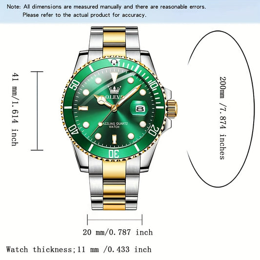 OLEVS Men'S Luxury Quartz Watch - Green Dial, Stainless Steel Band, Luminous Pointer Display, Quartz Movement, Electronic Drive, Zinc Alloy Case, Ideal for Business Casual Wea