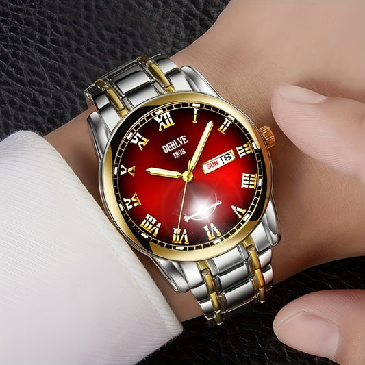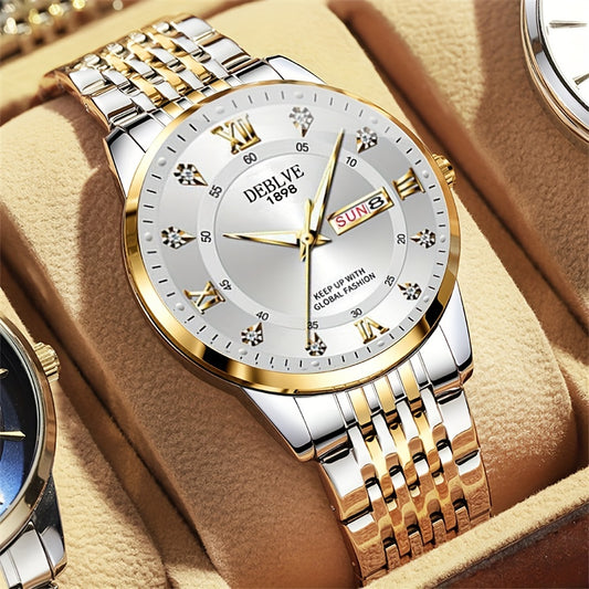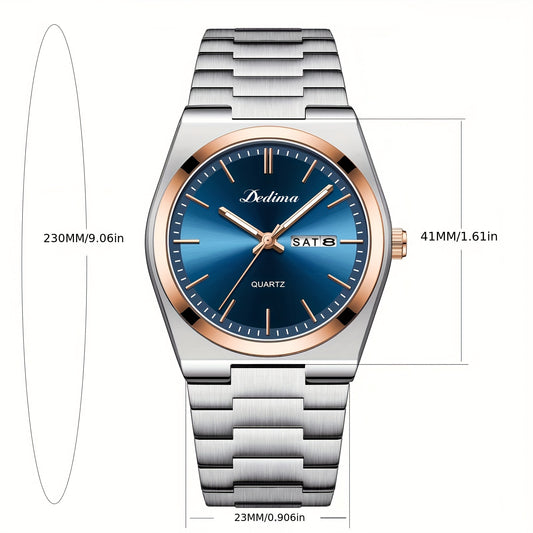 Elegant Men's Quartz Watch with Stainless Steel Band, Rivet Detail, and Dual Calendar - Non-Rechargeable Button Battery Included, DEDIMA