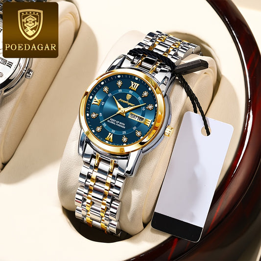 POEDAGAR Elegant Stainless Steel Quartz Watch for Women, Luminous Calendar, Round Alloy Case, Trendy Korean Style, Non-Rechargeable Battery, Watch Accessories
