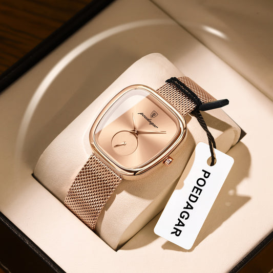 POEDAGAR Elegant Women's Quartz Watch - Waterproof, Stainless Steel Mesh Band, Rose Golden Square Dial, Black Strap, Perfect for Parties & Casual Attire, Stylish Timepiece | Elegant Design | Mesh Strap Watch, Watch Accessorie