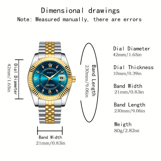KASRLUO Elegant Men's Quartz Watch - Luminous Date Display, Golden-Tone Stainless Steel Band, Business Style with Rhinestone Detailing, Battery Operated