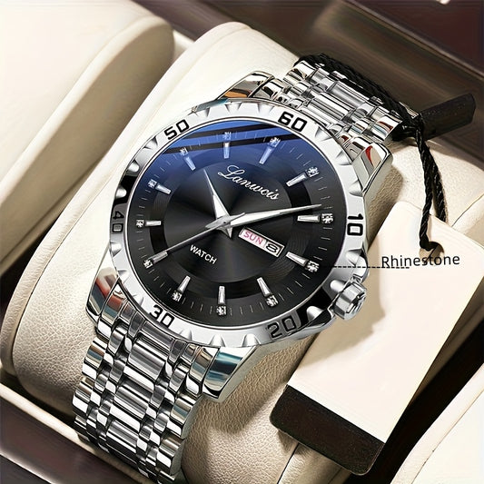 1pc Men's Business Style Stainless Steel Strap Watch - IPX7 Waterproof, Luminous Hands & Dial, Calendar & Week Display, Quartz Movement, Travel Leisure Sports Watch with Gift Box, Luxury Wristwatch | Sleek Metallic Finish | D