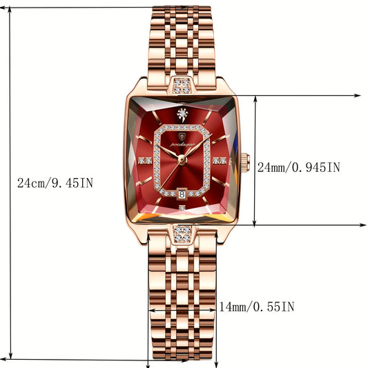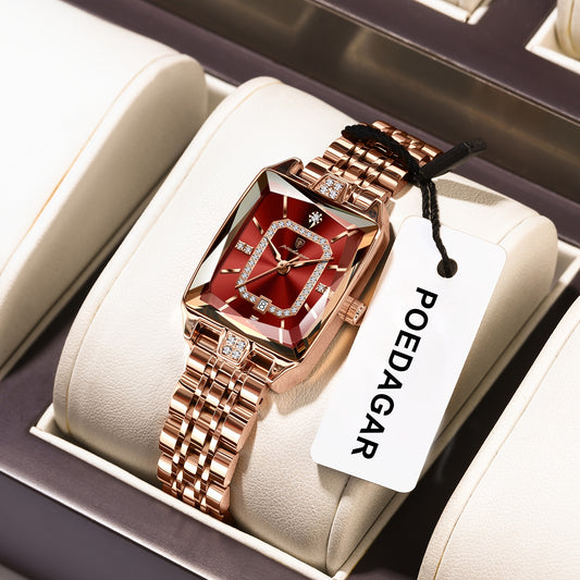 POEDAGAR Elegant Women's Quartz Watch - Rose Golden Stainless Steel, (3ATM), Square Dial with Gemstone Accents, Date Display, Luxury Fashion Accessory for Casual or Formal Occasions