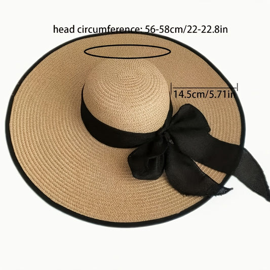 Elegant Women'S Wide Brim Straw Sun Hat with Black Bow - Stylish & Breathable Beach Hat for Summer, Ladies' Beach Accessory with Paper Straw Design, Beach Accessories|Bowknot Adornment|Paper Straw Material