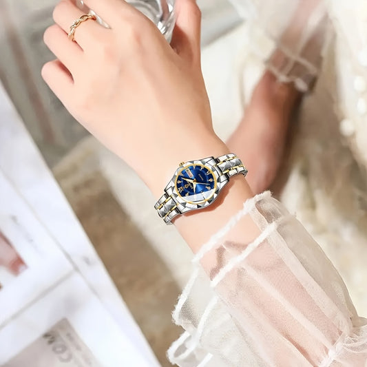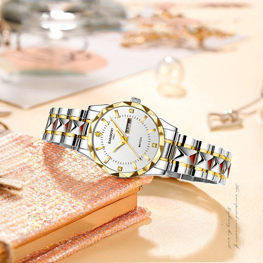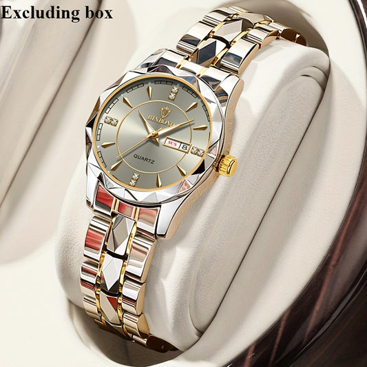 1pc BANBONY Women's Stainless Steel Quartz Watch with Rhinestone Accents, Scratch-Resistant Luminous Dial, IPX7 Waterproof, Week Calendar Display, Blue Dial & Golden-Tone Case - Luxury Casual Sports Watch for Birthdays, Holid