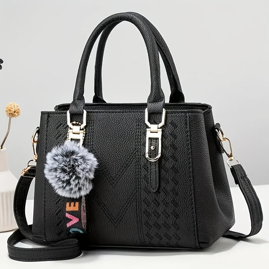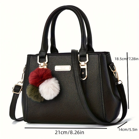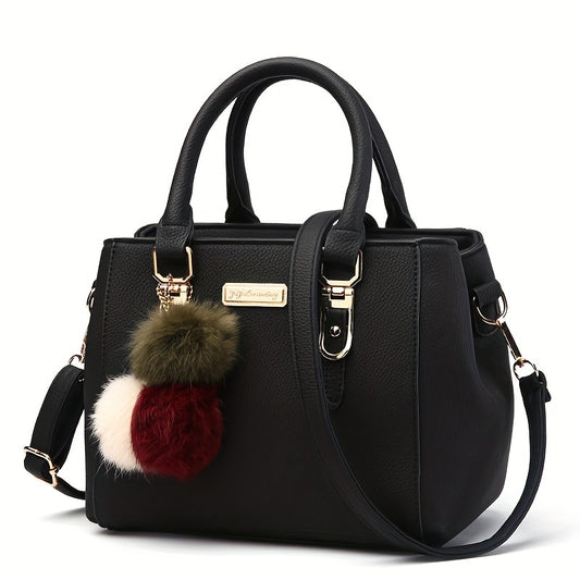Classic Solid Color Crossbody Bag, Trendy Elegant All-Match Top Handle Satchel Bag with Pom Pom Decor