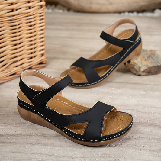 1 Pair Elegant Women'S Casual Wedge Sandals - Solid Color Mary-Jane Style with Hook-and-Loop Closure, Open Toe, Mid Heel, PU Upper/Inner/Insole, All-Season Comfort