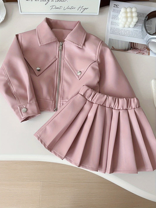 ' Fashion Faux Leather Jacket and Pleated Skirt Set for Ages 12 and Under - 73% Polyurethane, 24% Polyester, 3%, Non-Stretch Woven Fabric, Peplum Top with Flared Hem, Solid Color, Suitable for Spring/Fall