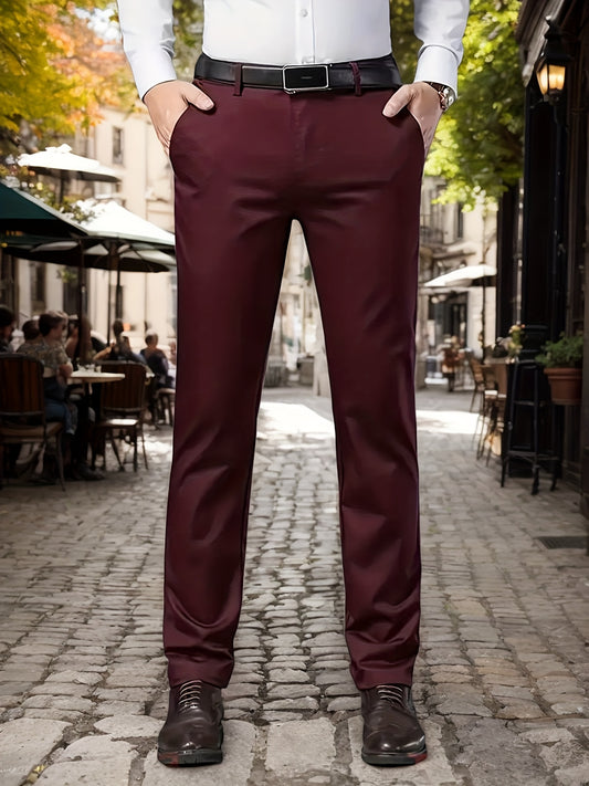 1 Pair Men's Classic Business Trousers - Burgundy Straight-Cut Polyester Dress Pants for Office, Casual Wear & All Seasons - Machine Washable