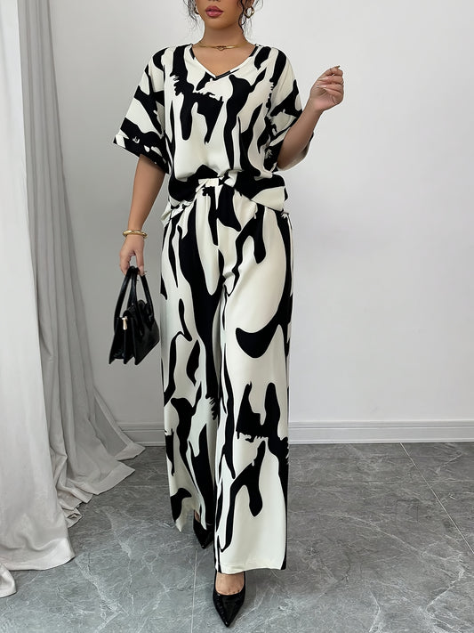 '-Yy0207476-2pcs Women'S V-Neck Short-Sleeved Black And White Printed Casual Top And Pants Set