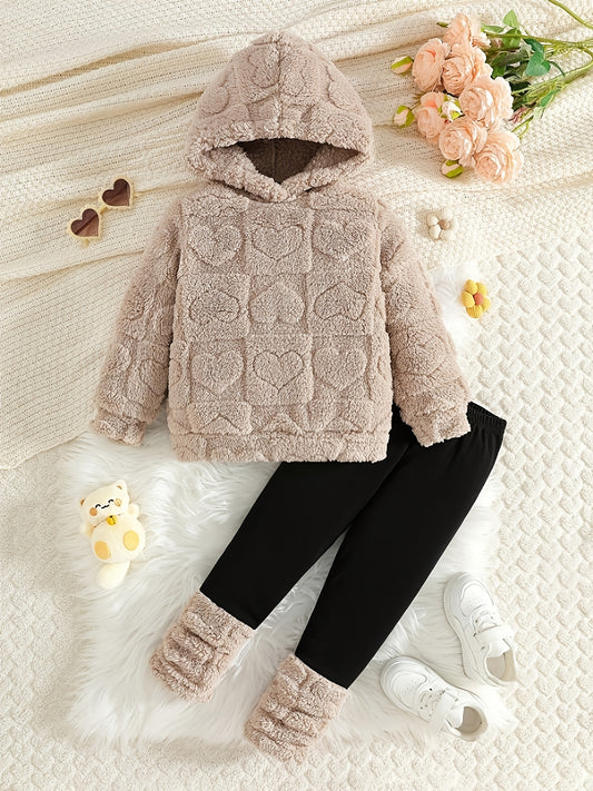 ' Cozy Fleece Hooded Sweatshirt & Pants Set - Warm Winter Outfit with Heart Pattern, Long Sleeve Pullover & Matching Pants, Perfect for Outdoor Play, Casual Style, Regular Fit, Winter Clothes for , Playful Design, Soft Textur