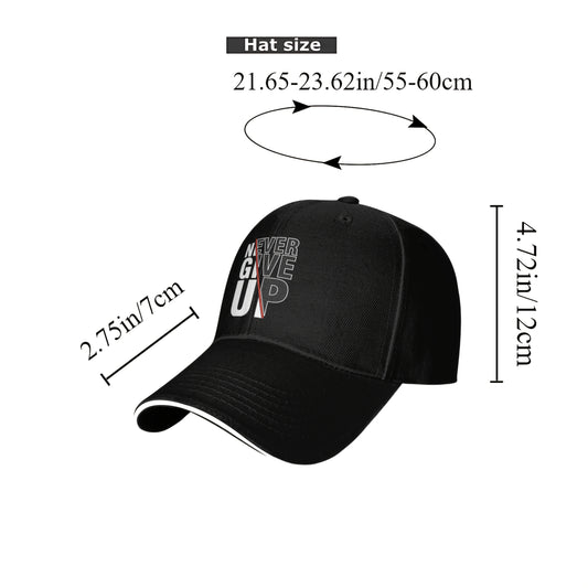 1 Pack Never Give Up Print Baseball Cap - Adjustable Snapback Dad Hat with Breathable Mesh Back, Funky Unisex Trucker Hat for Outdoor Fishing Driving, Black with White & Red Lettering, One Size Fits Most (53.34-63.5 cm)
